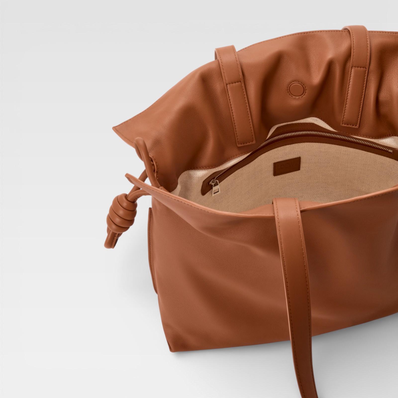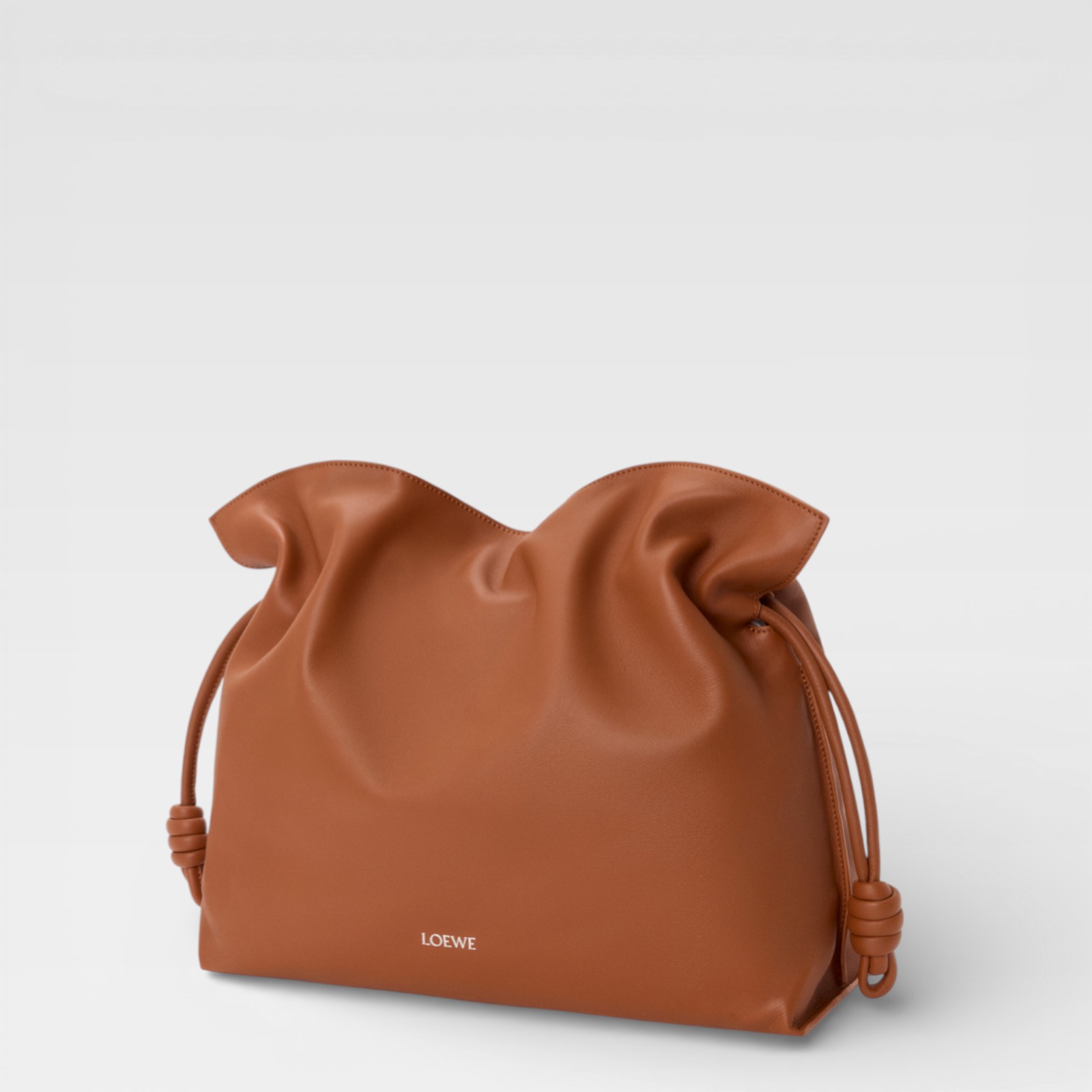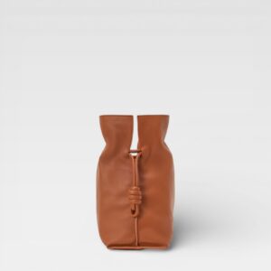 Bolso confeccionado en piel lisa de acabado suave, con silueta amplia y diseño recogido en la parte superior. Presenta asas largas para llevar al hombro y detalles laterales anudados que aportan un toque distintivo y moderno. El logotipo Loewe está grabado en la parte frontal inferior.