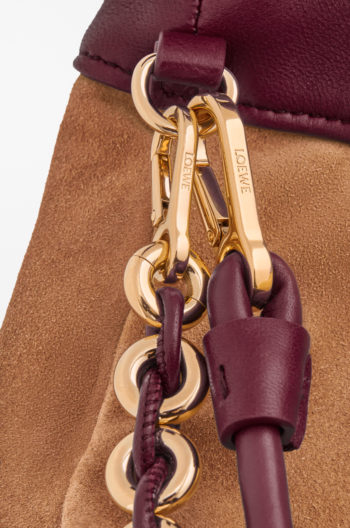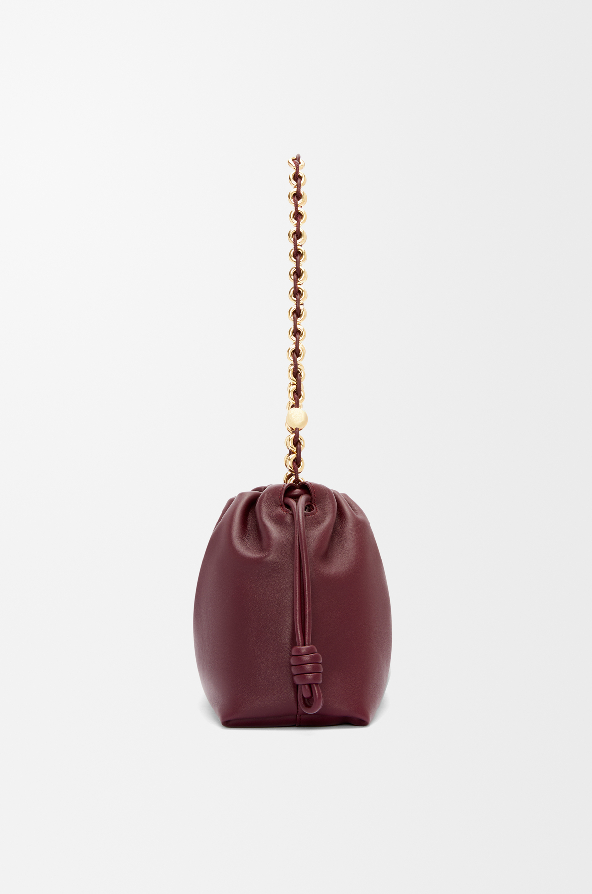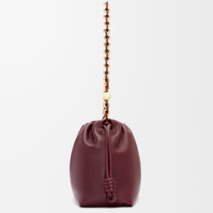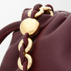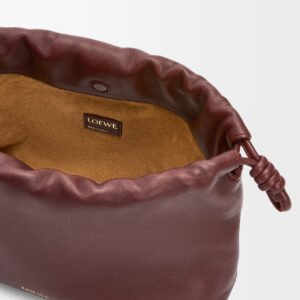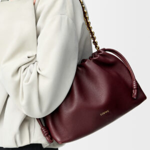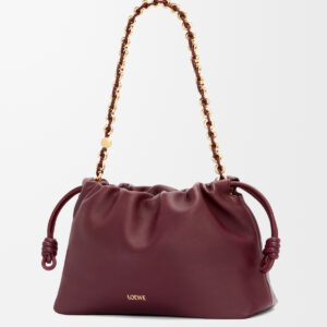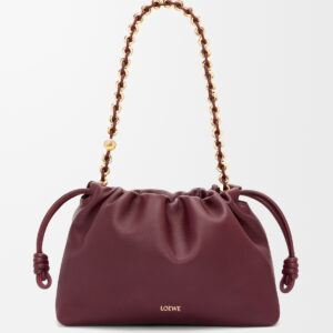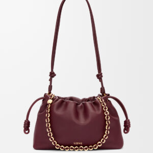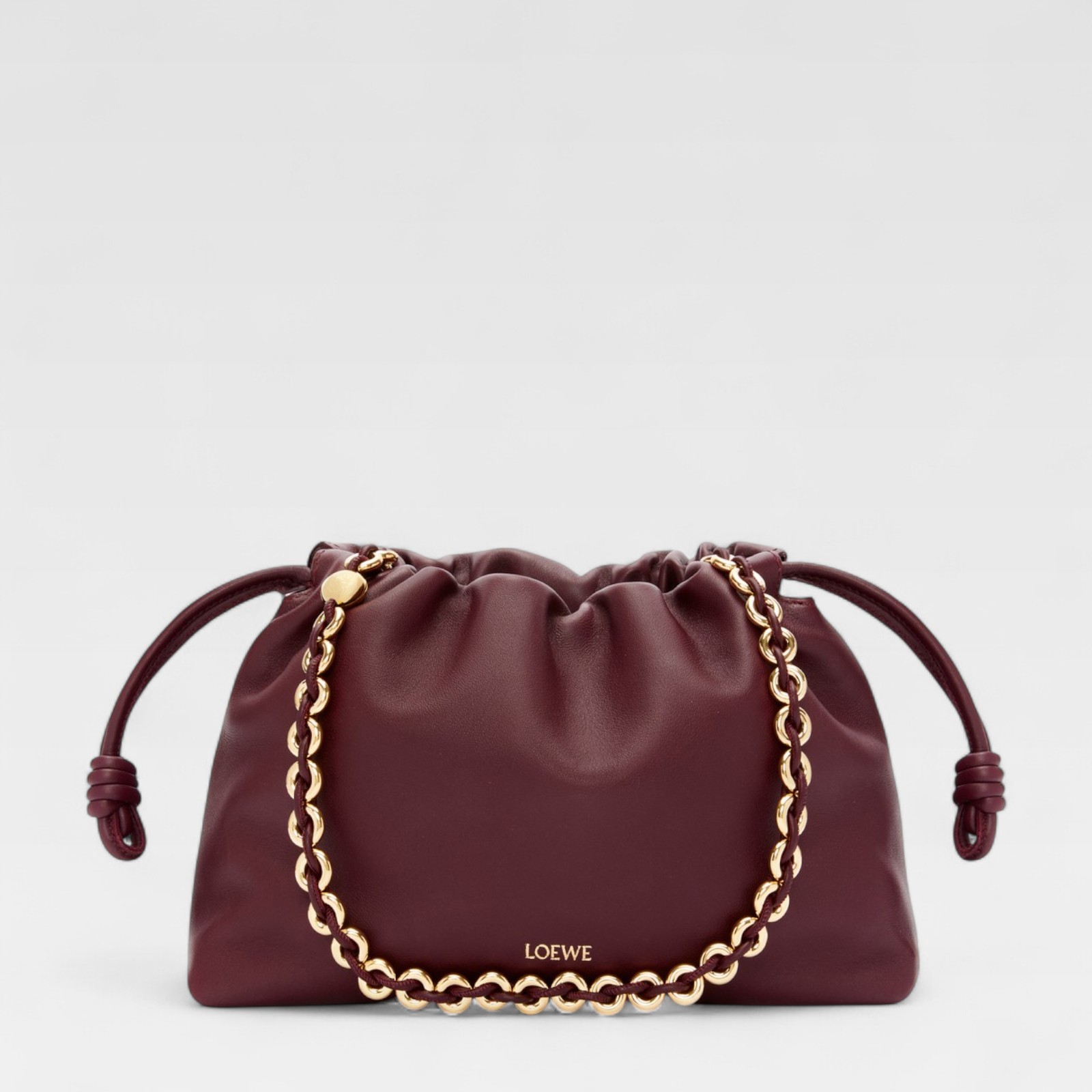 Un diseño suave con líneas escultóricas. El Flamenco Medium de Loewe está confeccionado en napa de cordero ultra flexible en tono burdeos oscuro. Su estructura relajada se acentúa con un cierre fruncido de cordones laterales anudados, mientras que una cadena dorada con eslabones redondeados añade contraste y elegancia. Ideal para llevar al hombro o cruzado gracias a su correa ajustable, es una pieza versátil y atemporal con el sello sutil de la casa.