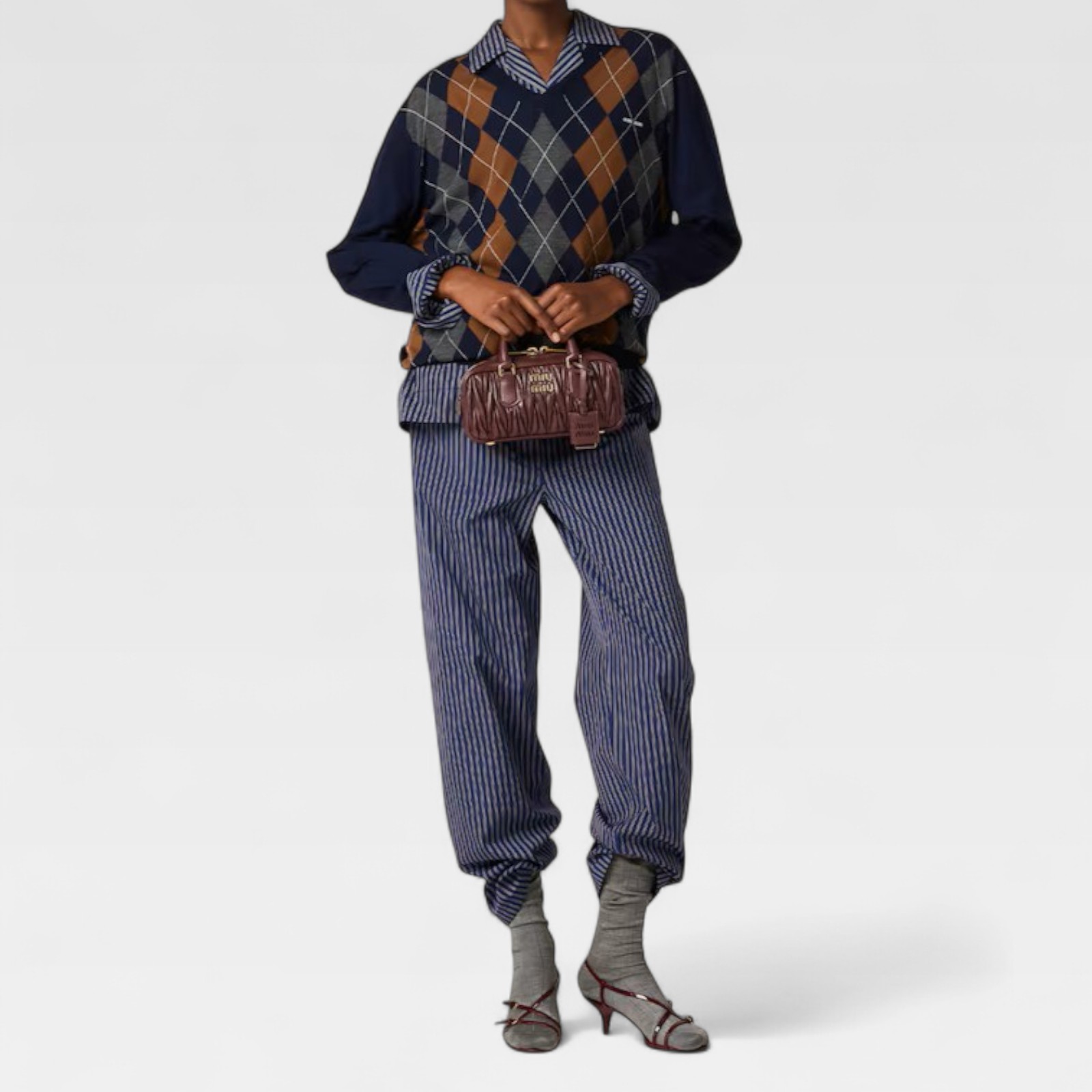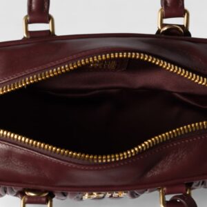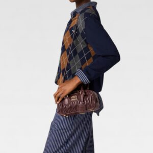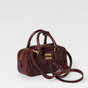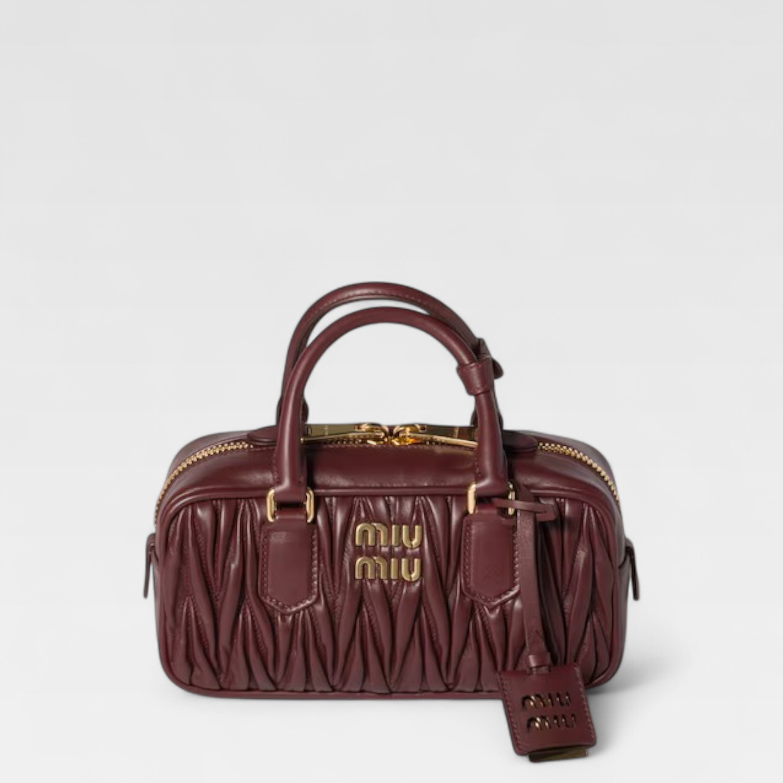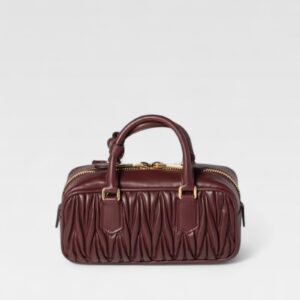 El modelo Arcadie de Miu Miu se reinventa en un elegante tono burdeos, fusionando tradición artesanal con un diseño moderno y versátil. Confeccionado en suave cuero de cordero y decorado con el característico acabado matelassé tridimensional, este bolso destaca por su textura única y su estructura compacta. Los herrajes dorados y el logo metálico frontal refuerzan su identidad visual, mientras que la funcionalidad se completa con asa superior, correa larga y un estuche extraíble.