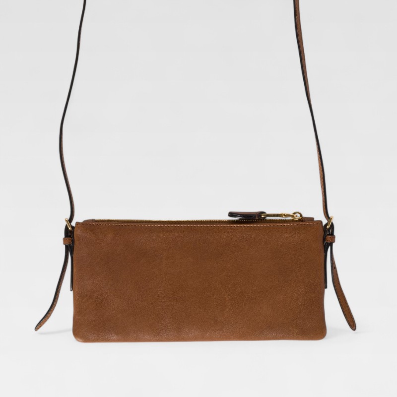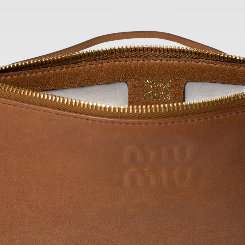Diseño utilitario con un enfoque sofisticado. El Aviator Contenitori Pouch de Miu Miu está confeccionado en cuero napa marrón suave, con un acabado acolchado y una silueta rectangular de inspiración aviador. Cuenta con un cierre de cremallera superior, asa ajustable de piel y forro, herrajes dorados y logo grabado en la parte delantera. Ideal para llevar lo esencial con estilo y un toque técnico.