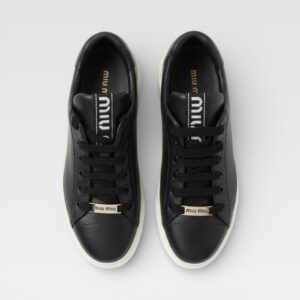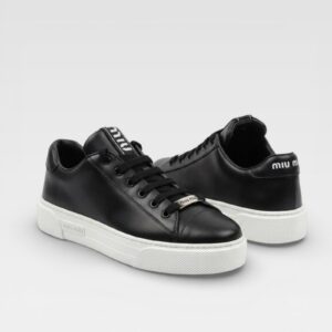 Un diseño limpio con identidad distintiva. Estas zapatillas de Miu Miu están confeccionadas en cuero negro de acabado liso y presentan una silueta minimalista de inspiración urbana. La suela de goma blanca con plataforma crea un contraste marcado con el empeine oscuro, mientras que los detalles del logo en la lengüeta, el talón y la placa metálica en los cordones aportan el sello característico de la marca. Un modelo versátil que combina fácilmente con looks casuales o más pulidos.