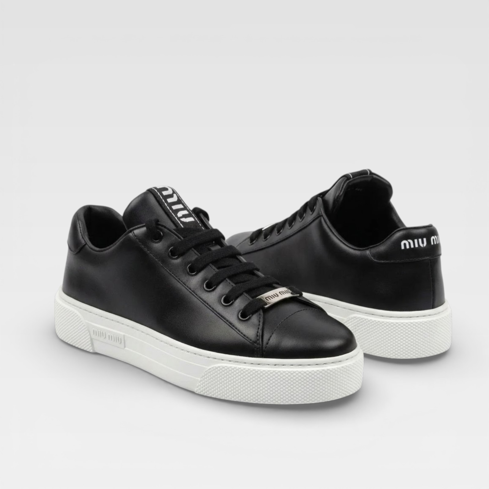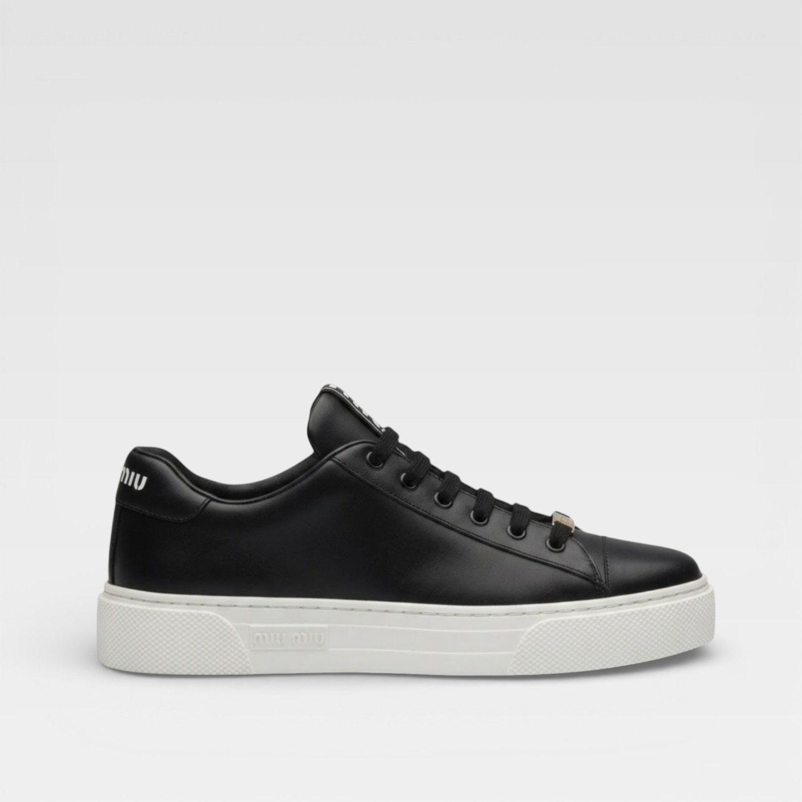 - Logo Miu Miu en la lengüeta y en el talón, placa metálica en los cordones, suela blanca texturizada