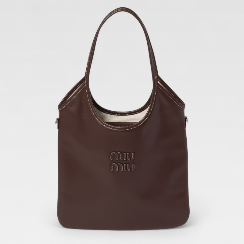 Diseño elegante y funcional con un estilo relajado. El Ivy Tote de Miu Miu está confeccionado en cuero suave color marrón con acabado ligeramente brillante y textura natural. Su silueta estructurada y minimalista se completa con el logo Miu Miu metálico en el frente. Incluye asas superiores. Ideal para el uso diario o viajes.