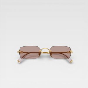 Diseño minimalista con carácter definido. Estas gafas de sol de Miu Miu presentan una silueta rectangular sin marco completo, con estructura metálica en tono dorado que aporta ligereza y sofisticación. Las lentes ahumadas en tono rosado suavizan el contraste y complementan el acabado brillante del metal. Las patillas finas incluyen detalles grabados que refuerzan la identidad de la marca.