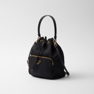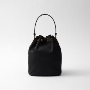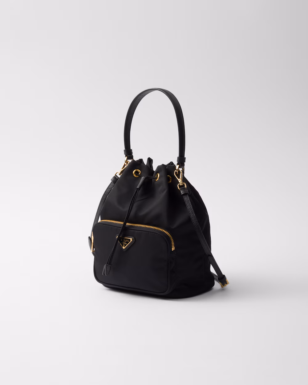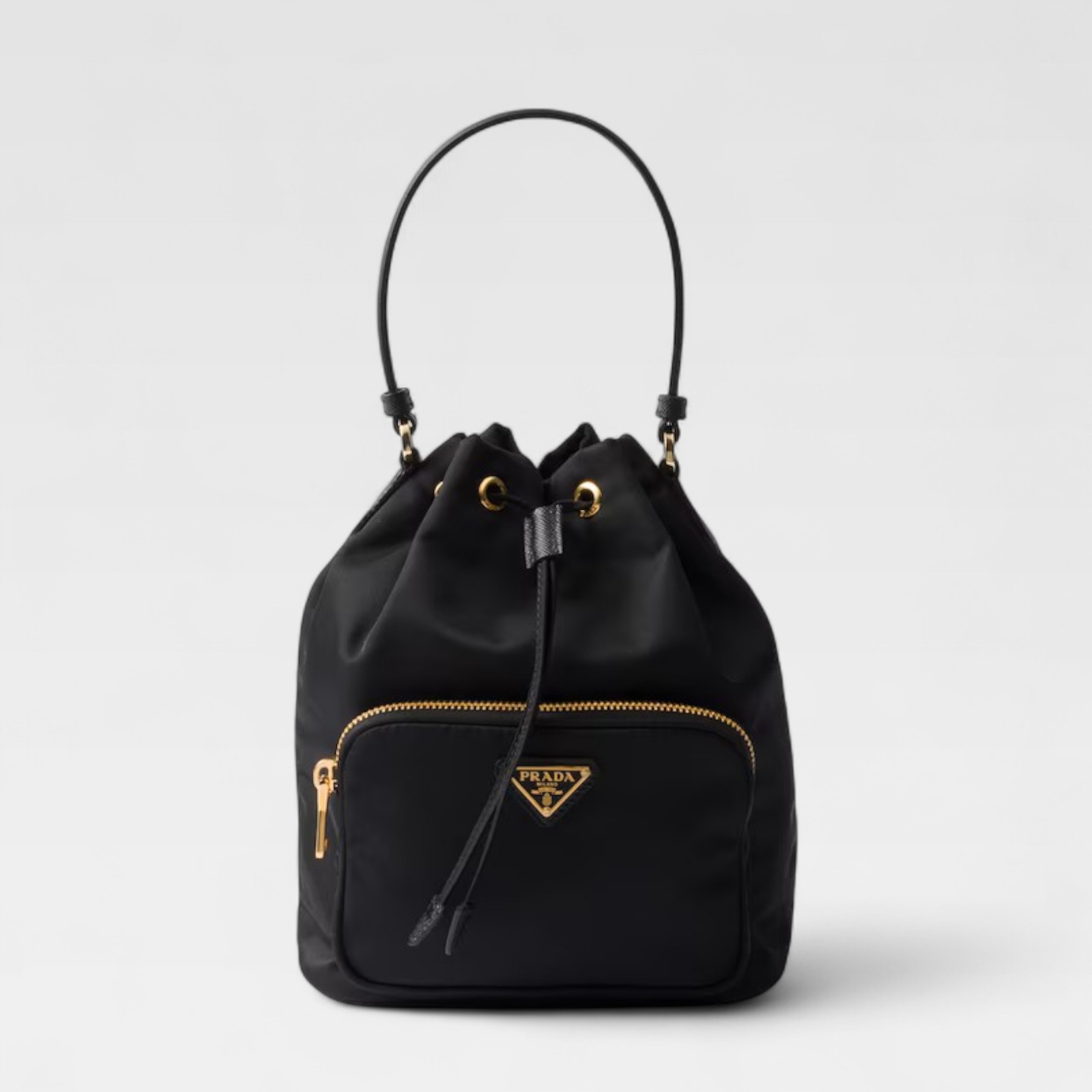 El bolso Duet de Prada combina el estilo práctico del formato bucket con la innovación sostenible de la maison. Confeccionado en Re-Nylon negro —el material reciclado exclusivo de Prada— y detalles en cuero tonal, presenta un diseño flexible con cierre ajustable de cordón. En el frente, un bolsillo con cremallera resalta con el icónico logo triangular esmaltado en dorado. Su asa superior y la correa larga ajustable lo convierten en una pieza versátil para el día a día.