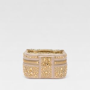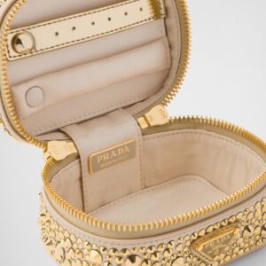 Un accesorio de alta elegancia pensado para resguardar joyas con estilo. Este estuche de Prada está confeccionado en satén beige y recubierto con cristales dorados en relieve que generan un efecto luminoso y sofisticado. El logo metálico triangular aparece en el frente, reforzando la identidad de la maison. En el interior, múltiples bolsillos y compartimentos acolchados aseguran la organización de piezas delicadas, mientras que el cierre de cremallera completa un diseño funcional y ornamental a la vez.