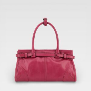Este bolso destaca por su estructura rígida y elegante acabado en cuero rosa, complementado por asas dobles y detalles de hebilla dorada en los laterales. El emblemático triángulo metálico con el logo de Prada en la parte frontal aporta un toque distintivo y sofisticado al diseño clásico, ideal para llevar en la mano.