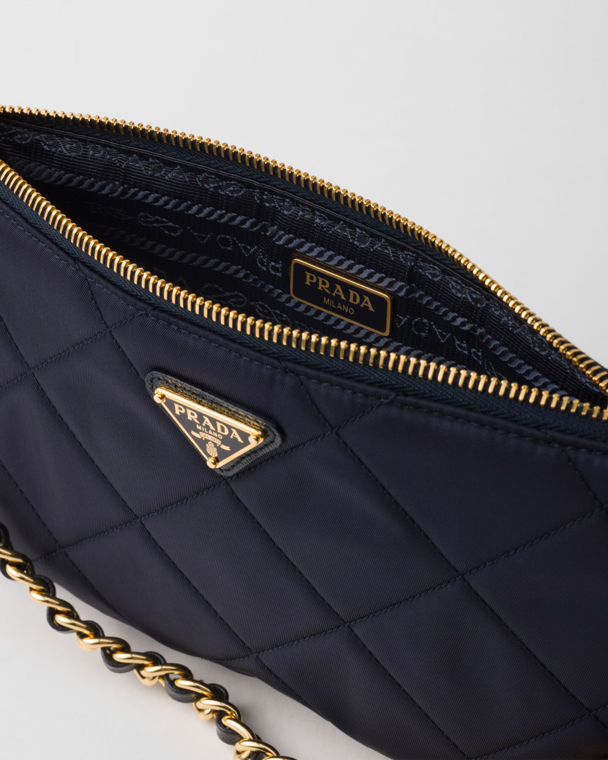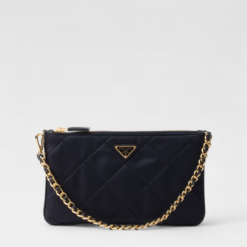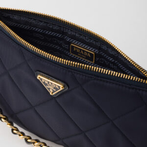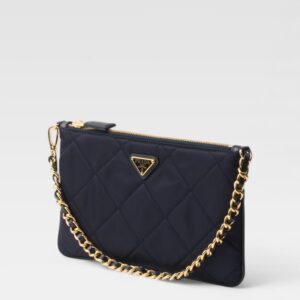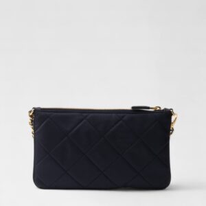 Inspirado en los archivos de la casa, el Re-Edition 1995 Chaine Pouch de Prada combina nostalgia y sostenibilidad. Confeccionado en Re-Nylon —el material reciclado exclusivo de la marca— este pouch negro de silueta estructurada presenta una elegante cadena metálica dorada que permite llevarlo al hombro. El icónico logo triangular esmaltado en el frente completa esta pieza funcional y moderna.