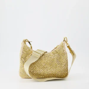 Una reinterpretación de lujo de un modelo icónico. Este Re-Edition 2005 de Prada brilla en su versión más glam: completamente cubierto de cristales dorados sobre base beige, creando un efecto deslumbrante. Incluye una correa de cinta tono sobre tono con una mini pochette desmontable y detalles metálicos dorados que completan el diseño. Ideal para elevar cualquier look nocturno con actitud y brillo.
