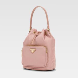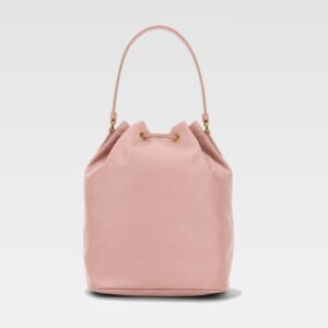 Bolso de diseño tipo saco en tejido liso, con cordón ajustable en la parte superior, detalles metálicos dorados y una práctica asa superior. Incluye bolsillo frontal con cremallera y distintivo logo triangular metálico al frente, ideal para complementar looks casuales y sofisticados.