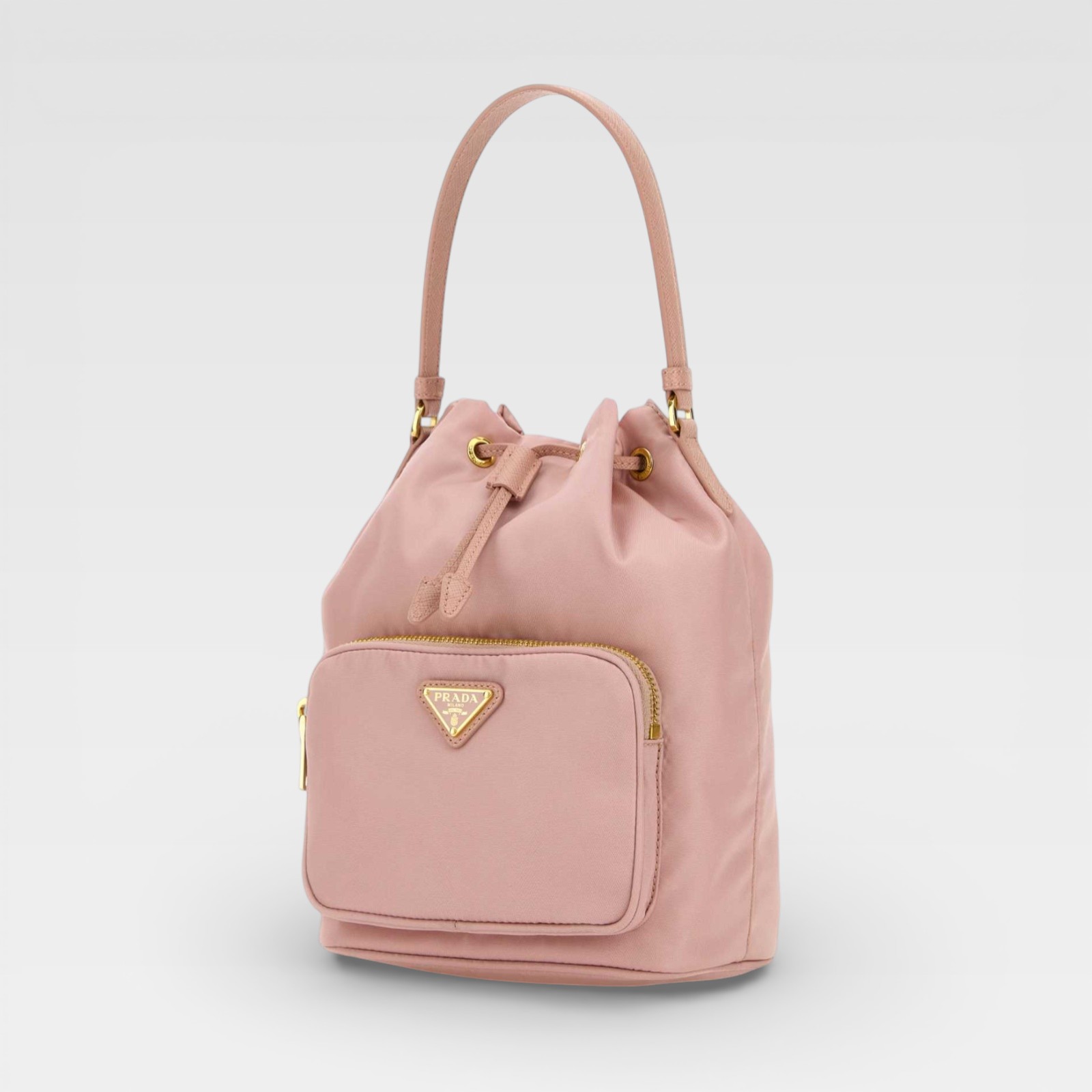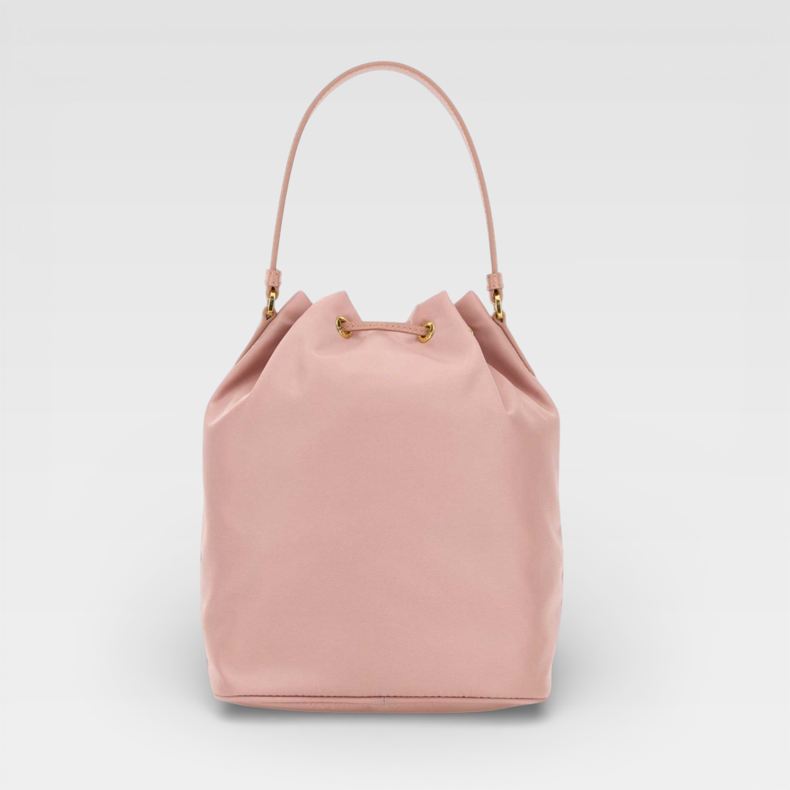 Bolso de diseño tipo saco en tejido liso, con cordón ajustable en la parte superior, detalles metálicos dorados y una práctica asa superior. Incluye bolsillo frontal con cremallera y distintivo logo triangular metálico al frente, ideal para complementar looks casuales y sofisticados.