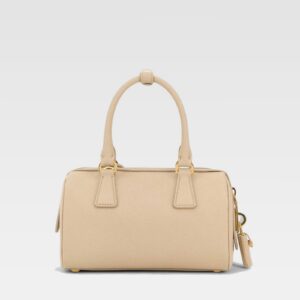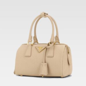 Bolso estructurado confeccionado en material texturizado beige, realzado con detalles metálicos dorados y el distintivo triángulo Prada en el frente. Incorpora dos asas superiores redondeadas y un colgante decorativo, aportando un toque sofisticado y práctico a cada conjunto.