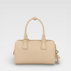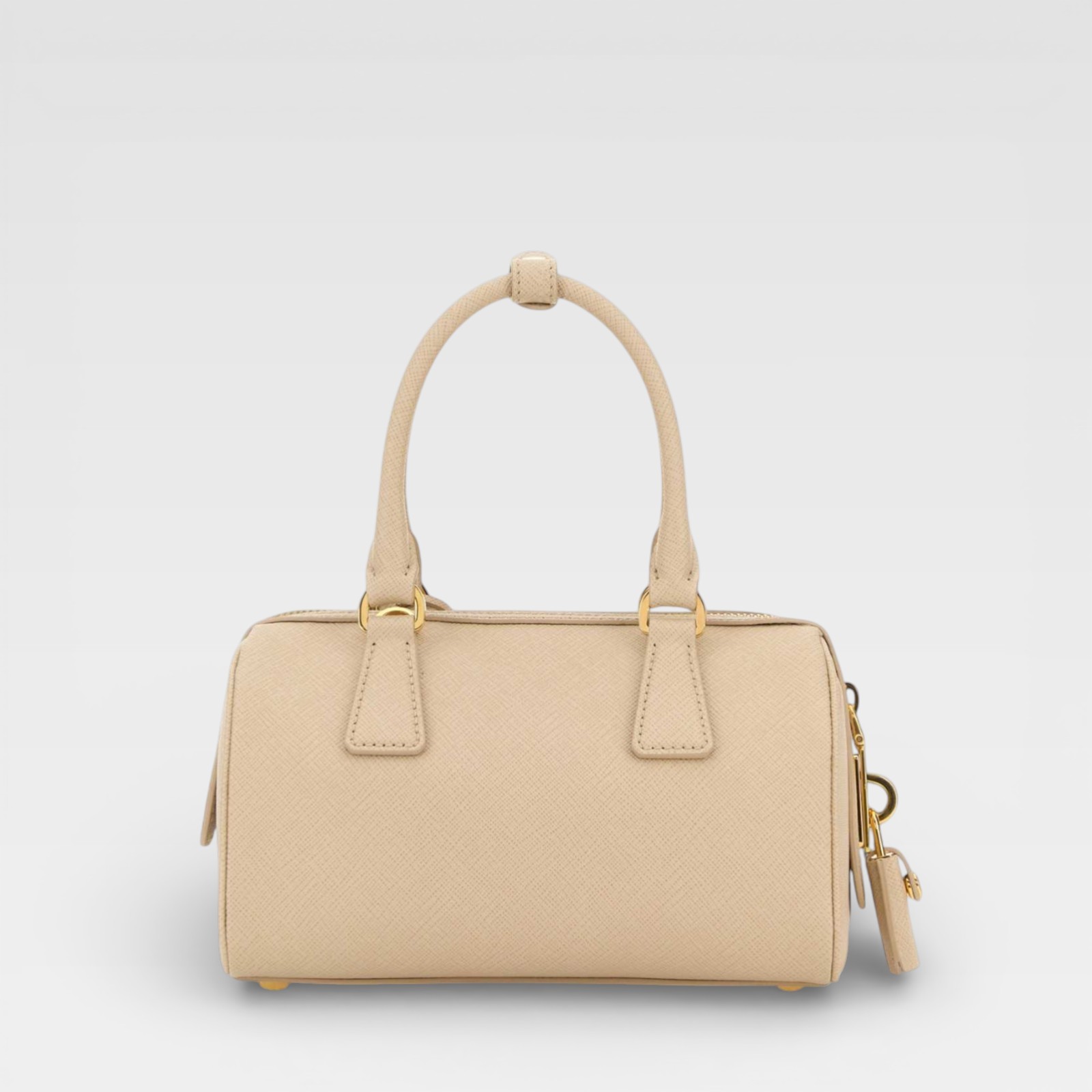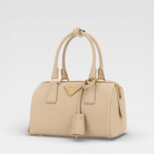 Bolso estructurado confeccionado en material texturizado beige, realzado con detalles metálicos dorados y el distintivo triángulo Prada en el frente. Incorpora dos asas superiores redondeadas y un colgante decorativo, aportando un toque sofisticado y práctico a cada conjunto.