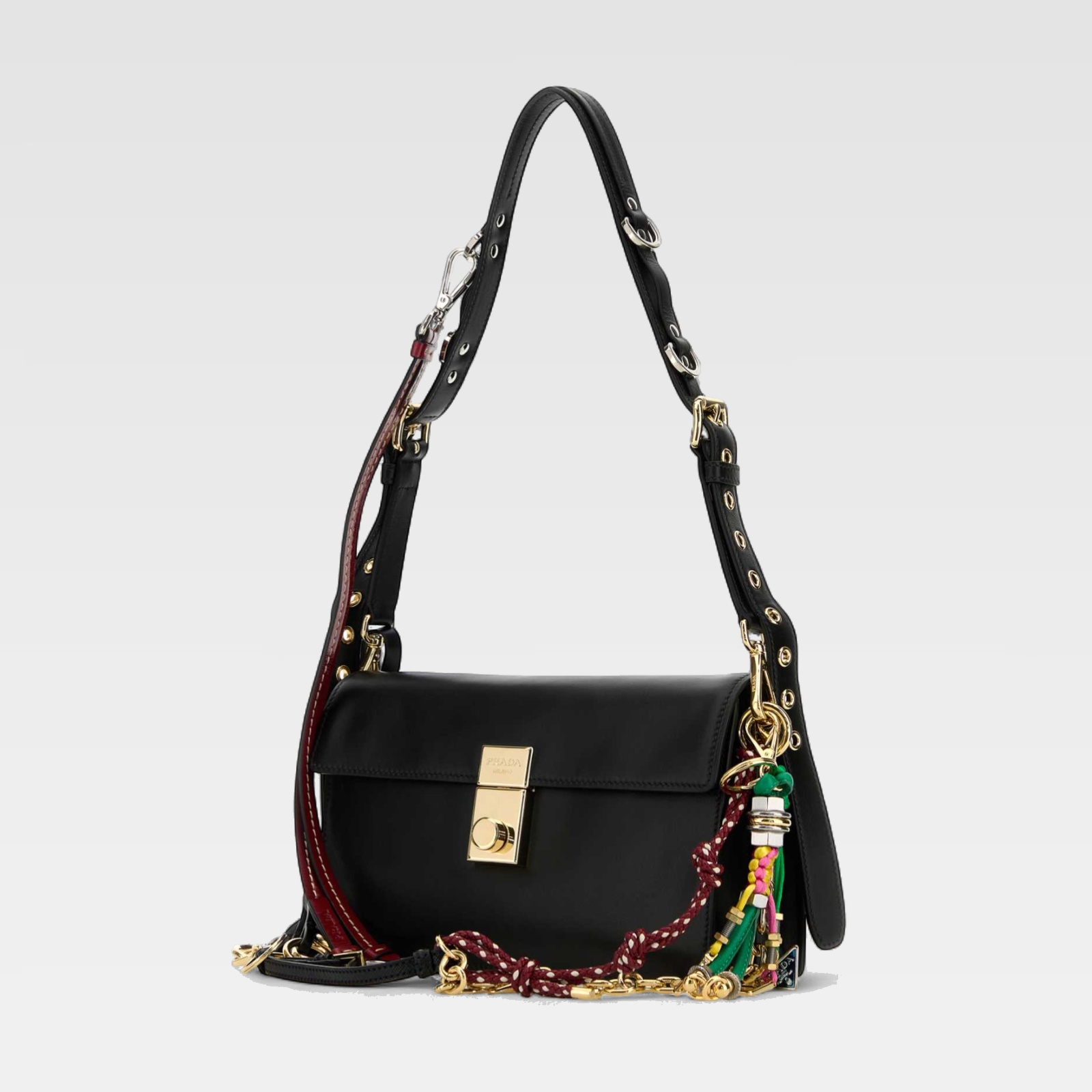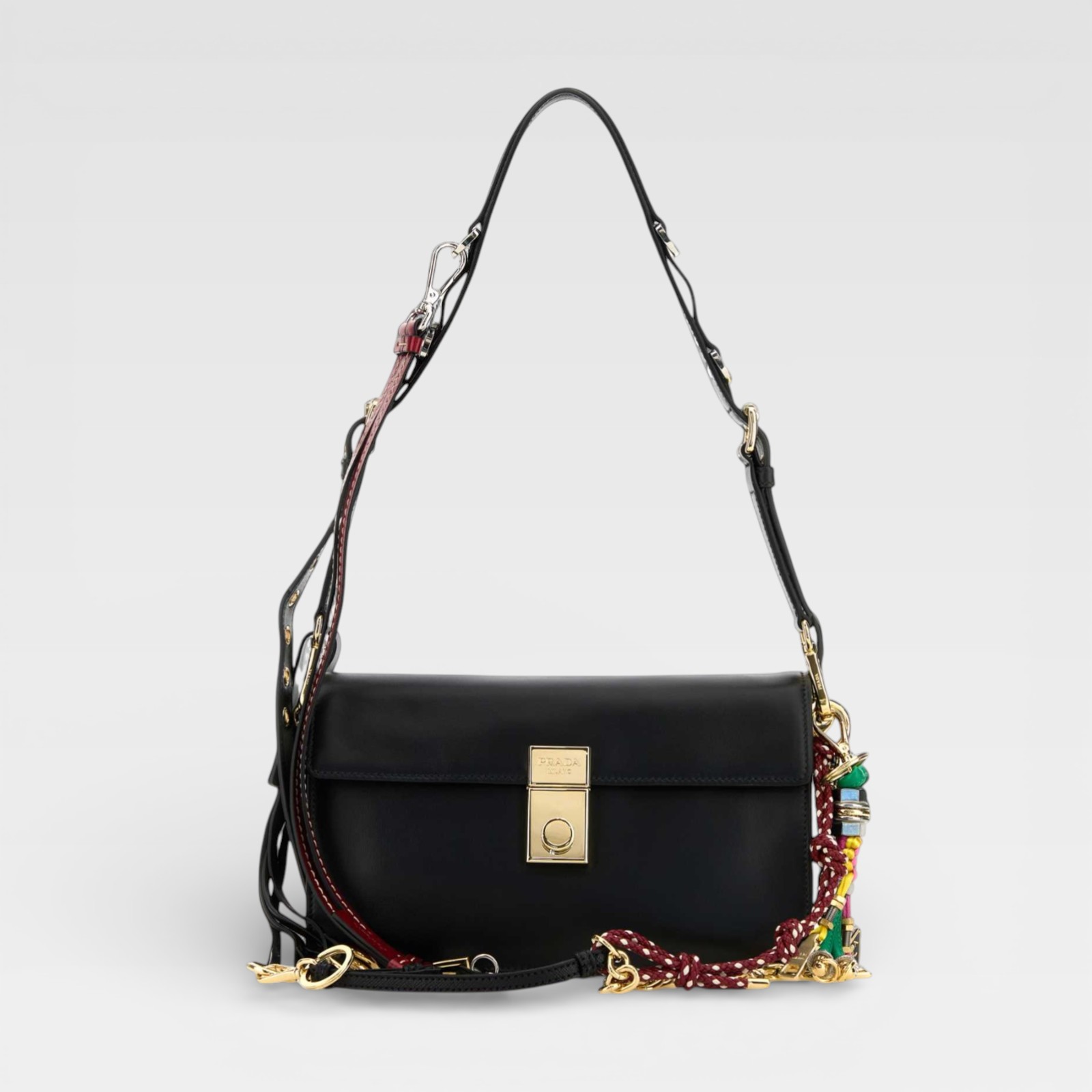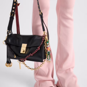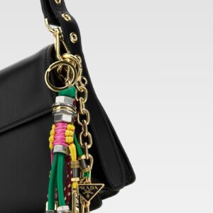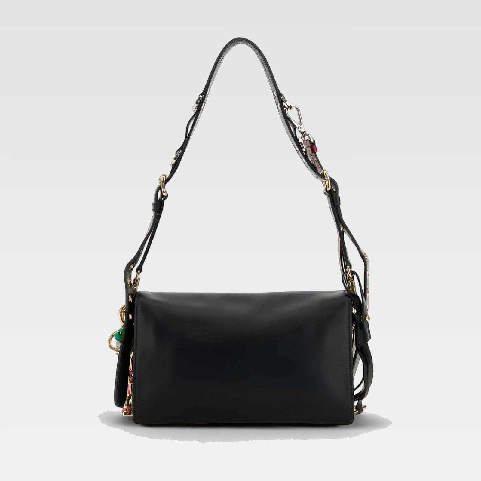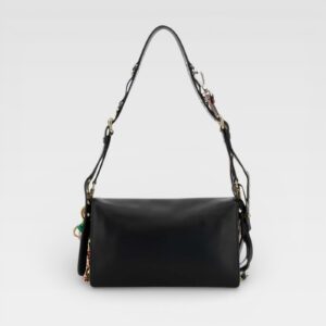 Bolso de estructura rectangular confeccionado en piel negra, con solapa frontal y cierre metálico dorado. Destaca por su correa de hombro ajustable y una correa adicional decorada con detalles trenzados multicolor y apliques metálicos, aportando un toque único y moderno al diseño clásico.
