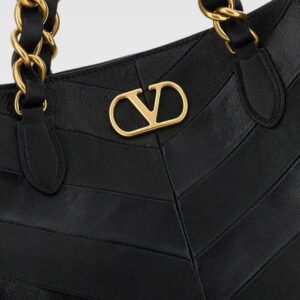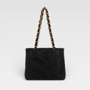 Bolso tote confeccionado en cuero negro con diseño de patrón chevron y estructura rígida. Incorpora asas de cadena dorada entrelazadas con cuero, además de un logotipo metálico al frente que aporta un toque distintivo y elegante. Su tamaño compacto lo hace ideal para llevarlo en el hombro o en la mano.