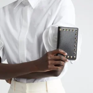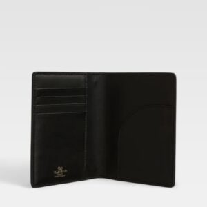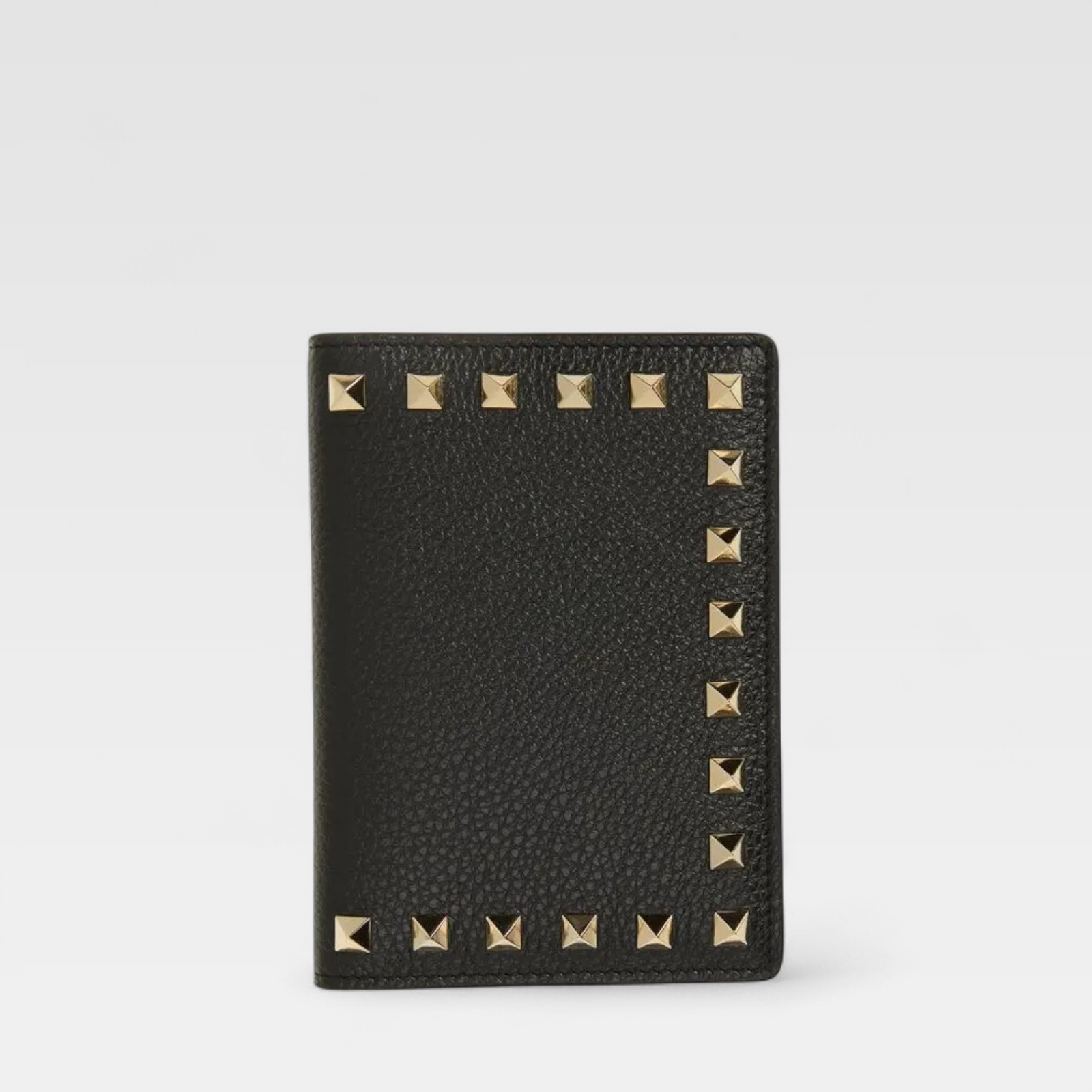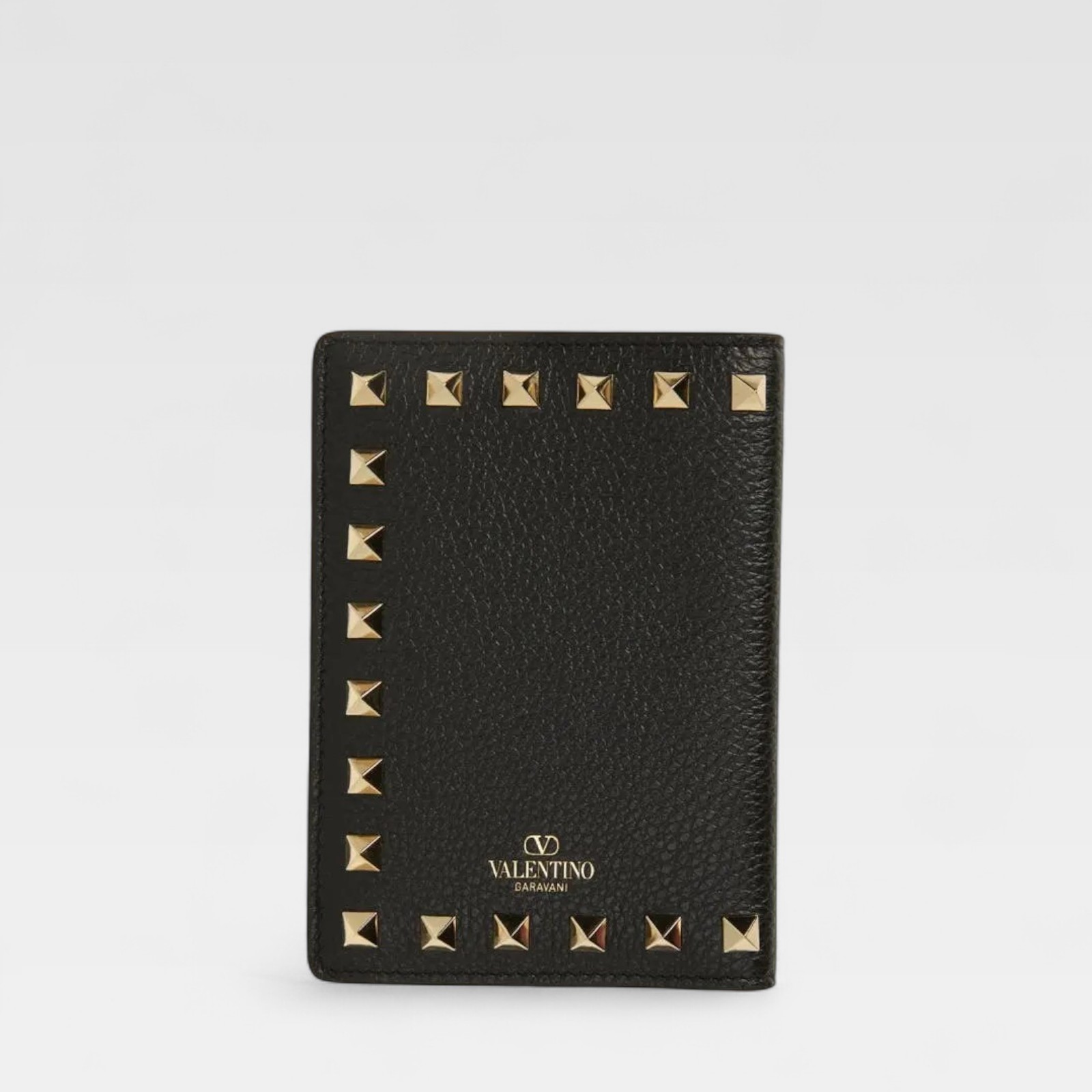 Un accesorio funcional con el carácter distintivo de Valentino. Este porta pasaporte está confeccionado en cuero negro y adornado con las icónicas tachuelas Rockstud en tono dorado, dispuestas de forma sutil a lo largo de los bordes. Su diseño estructurado ofrece espacio suficiente para resguardar documentos y tarjetas, combinando practicidad con un estilo inconfundible.