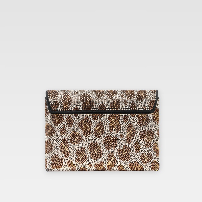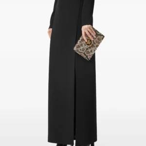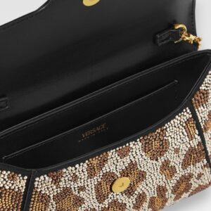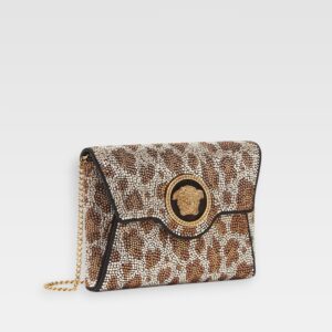 Un clutch que no pasa desapercibido. Esta edición especial del La Medusa de Versace presenta un impactante diseño en animal print, completamente decorado con cristales brillantes que forman un patrón de leopardo. El icónico medallón de Medusa en el centro aporta el sello inconfundible de la marca. Su estructura rígida y su formato compacto lo hacen ideal para ocasiones nocturnas o eventos formales, con una cadena metálica dorada para llevarlo al hombro o cruzado.