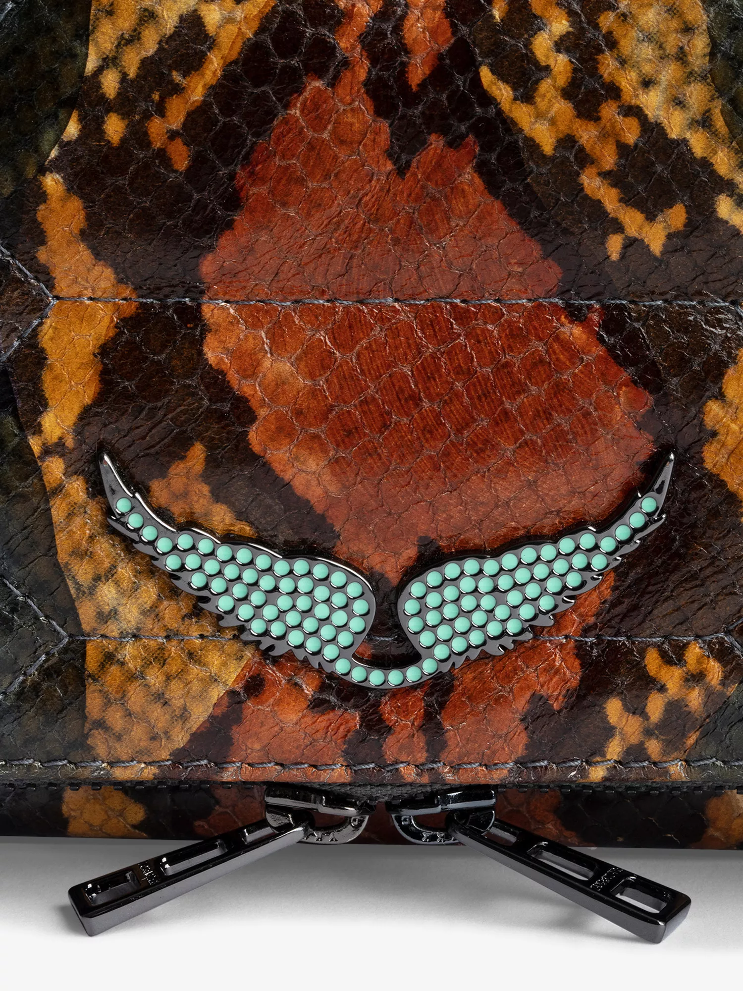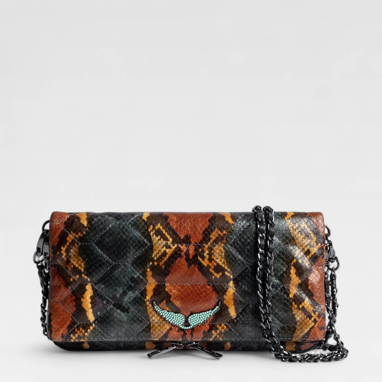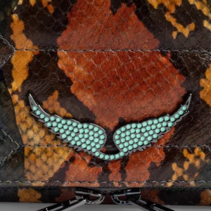 Un diseño que mezcla textura, color y carácter. El Rock Mat XL de Zadig & Voltaire está confeccionado en cuero con estampado de pitón en tonos tierra y verdes oscuros, con acabado acolchado y detalle frontal de alas metálicas en color turquesa. La cadena negra permite llevarlo al hombro o cruzado, aportando versatilidad a un diseño audaz y llamativo.
